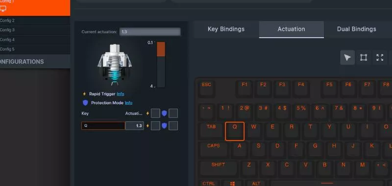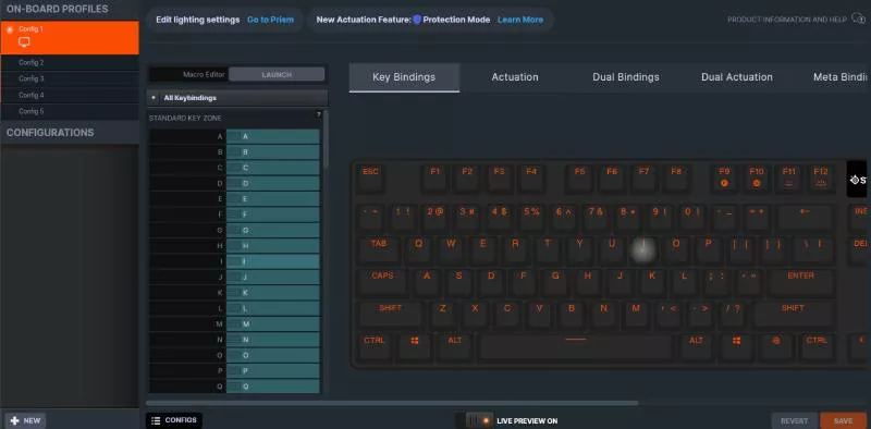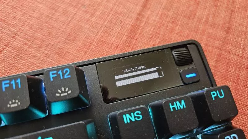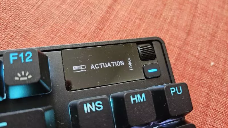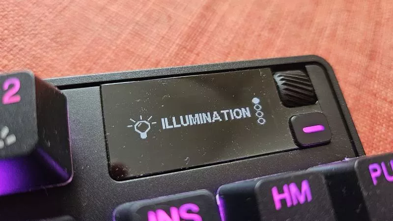 Po delším stisknutí tlačítka s diodou se objeví položku Illumination (podsvícení), Macros (makra), Actuation (zdvih), Configs a Display. Intenzitu stisku tak lze rychle přepínat i na klávesnici a není třeba spouštět doprovodnou aplikaci. Otočným kolečkem vedle displeje lze také například snadno a rychle ovládat hlasitost reproduktoru nebo sluchátek.