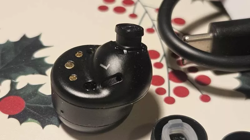 Nabíjecí pouzdro je, jak jsme již zmínili, o trochu menší a lehčí než u modelu AZ80, kvalita zpracování a použité materiály jsou stejné. Tělo pouzdra je kvůli možnosti bezdrátového dobíjení plastové, víko je kovové. Otevírání je snadné a jde to i jednou rukou, magnetický odpor při otevírání víka je menší než u AZ80, stejně jako je slabší i magnetické přichycení sluchátek v pouzdru. Sluchátka se tak snadno vyndavají a při zandavání se automaticky magneticky usadí. Pouzdro působí solidním dojmem, víko se nekývá. Na zadní straně je USB-C konektor pro napájení, ale sluchátka lze dobíjet i bezdrátově.