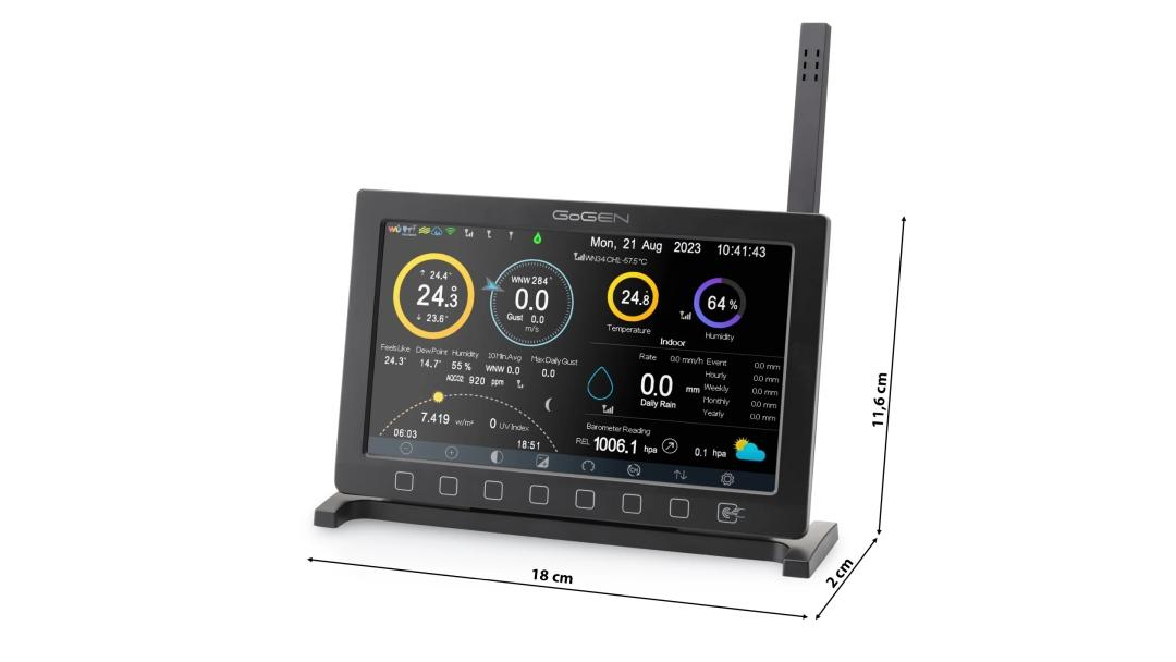 Na rozdíl od zařízení se segmentovými displeji má Gogen ME9900 TFT obrazovku, na které ukazuje detailní informace o vnitřní i venkovní teplotě, síle a směru větru, intenzitě dešťových srážek, atmosférickém tlaku či intenzitě slunečního svitu, stejně jako čas východu a západu slunce nebo aktuální fázi měsíce. A mohli bychom pokračovat dál, protože informací na displeji najdeme ještě mnohem víc. Podařilo se je navíc prezentovat velmi přehlednou grafikou, kdy jsou nejdůležitější údaje dobře vidět i z větší dálky.