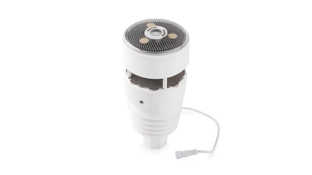 Za pozornost stojí také venkovní modul stanice, který se velmi liší od běžného příslušenství v podobě větrníčku a nálevky pro měření síly a směru větru a množství srážek. Vše je řešeno digitálně prostřednictvím senzorů. Stačí jen modul nasadit na trubku s coulovým průměrem a vhodně ho umístit na zahradě. Modul je poháněný bateriemi a má i solární panel. Trochu na něm ale ruší kabel s koncovkou pro připojení k napájení vyhřívání modulu (které ovšem není součástí balení).