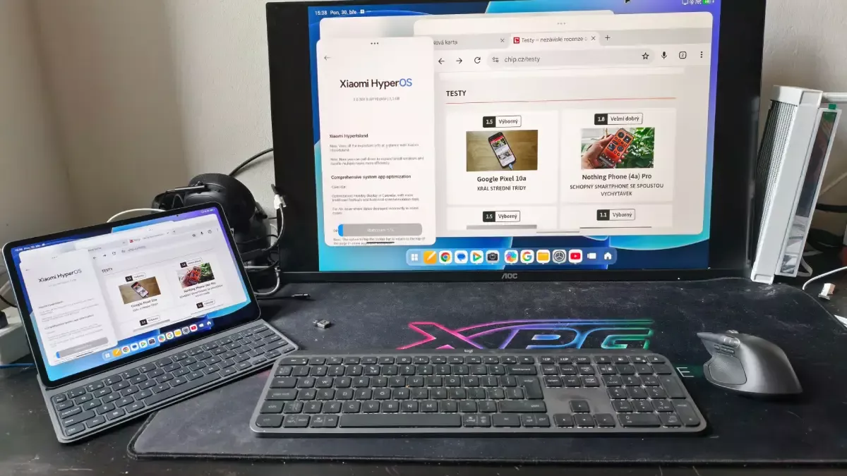 Desktopový režim Xiaomi umožňuje práci s více okny, takže pokud tablet připojíte k USB-C monitoru, myši a klávesnici, dá se na něm pohodlně pracovat s e-mailem i základními funkcemi kancelářských aplikací, dají se na něm sledovat internetové stránky nebo filmy a domácí jednoduchý počítač nahradí. Systém Xiaomi ale podporuje u každé aplikace pouze jedno otevřené okno a možnosti posouvání oken po pracovní ploše jsou omezené, škoda, že nejde využít externí monitor jako druhou obrazovku, pouze zrcadlí obrazovku tabletu. V tomto ohledu jsou možnosti desktopového režimu u Samsungu a Applu bohatší.