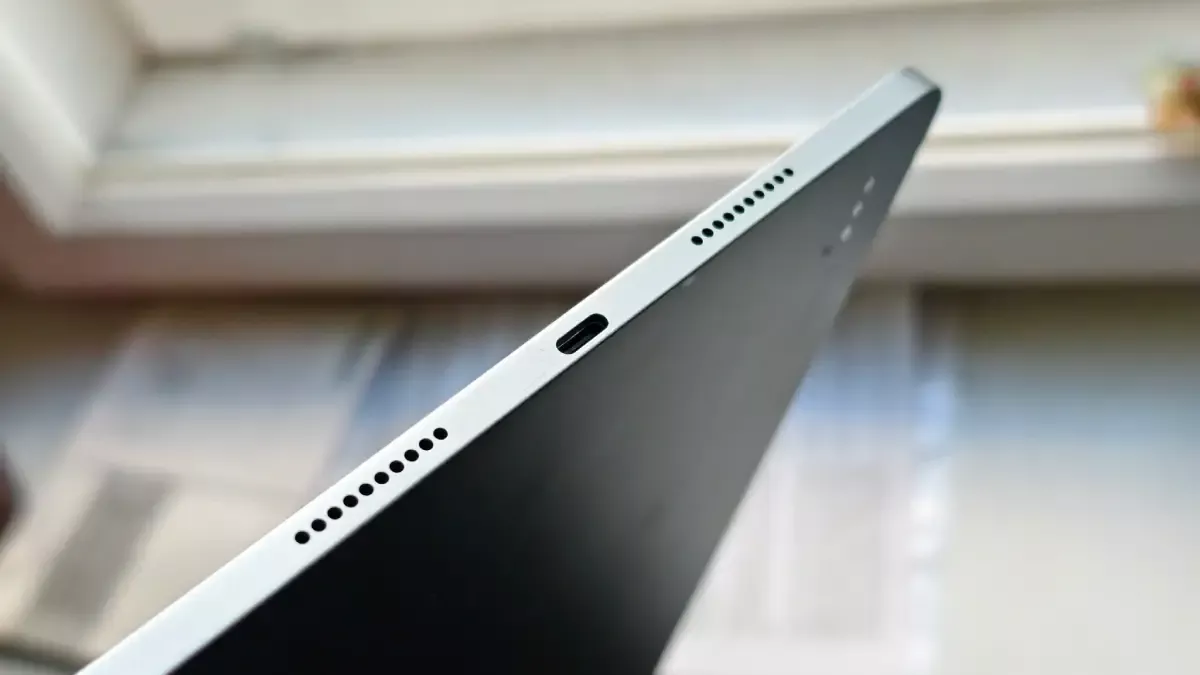 USB-C konektor posílá data přes standard USB 3.2 Gen1, tedy 5Gb rychlostí, což je jen drobný kompromis oproti 10Gb variantě USB 3.2 Gen2. Ve výbavě najdeme i infračervený port pro dálkové ovládání televizoru, na boku je senzor otisků prstů. Na tenkých bocích tabletu najdeme dále výdechy čtyř reproduktorů a USB-C konektor, ale 3,5mm audiokonektor chybí, stejně jako slot pro paměťovou kartu nebo NFC čip.