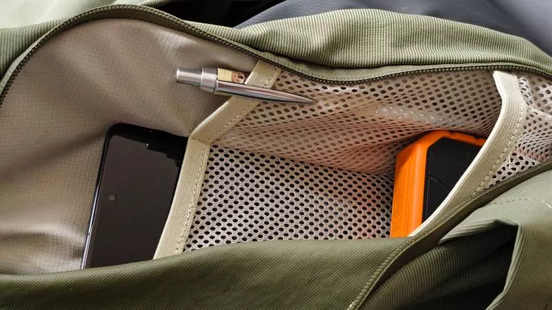 Velký vnitřní prostor batohu se uzavírá krytem se zipem, který má nahoře ještě praktickou zipem uzavíratelnou kapsu pro uložení drobností, klíčů a dokladů. Batoh vepředu překrytý pogumovaným voděodolným materiálem, za kterým se skrývá další kapsa pro uložení mapy nebo zámku na kolo. Stejná pogumovaná vrstva chrání i spodek batohu a v ní se nachází další kapsa, ve které je složená reflexní pláštěnka pro ochranu obsahu batohu v případě opravdu intenzivního deště, případně ji lze použít pro večerní nebo noční jízdu či chůzi po silnici, protože zlepšuje viditelnost jezdce nebo chodce.