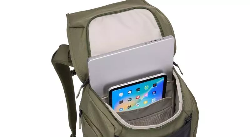 K hlavním výhodám batohu Thule Paramount 28 l patří objemný vnitřní prostor, vybavený dvěma kapsami pro uložení notebooku a tabletu nebo čtečky a menší uzavíratelnou kapsičkou pro jeden nebo dva smartphony. Po stranách batohu jsou pak dvě zvenčí přístupné boční kapsy uzavřené zipem, které mají uvnitř ještě dvě kapsy. Na pravé vnější straně boční kapsy je prostor pro uložení lahve s vodou.