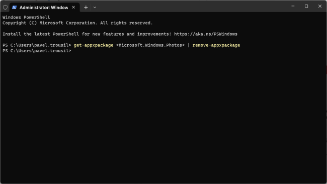 Chcete-li tuto aplikaci odinstalovat, otevřete okno příkazového řádku systému Windows nebo terminál s právy správce. Poté zadejte příkaz "get-appxpackage *Microsoft.Windows.Photos* | remove-appxpackage". Operační systém nyní odinstaluje aplikaci Fotografie systému Windows. Pokud budete chtít mít tuto aplikaci později znovu k dispozici, otevřete jednoduše obchod Microsoft Store a nainstalujte z něj software "Microsoft Fotografie".