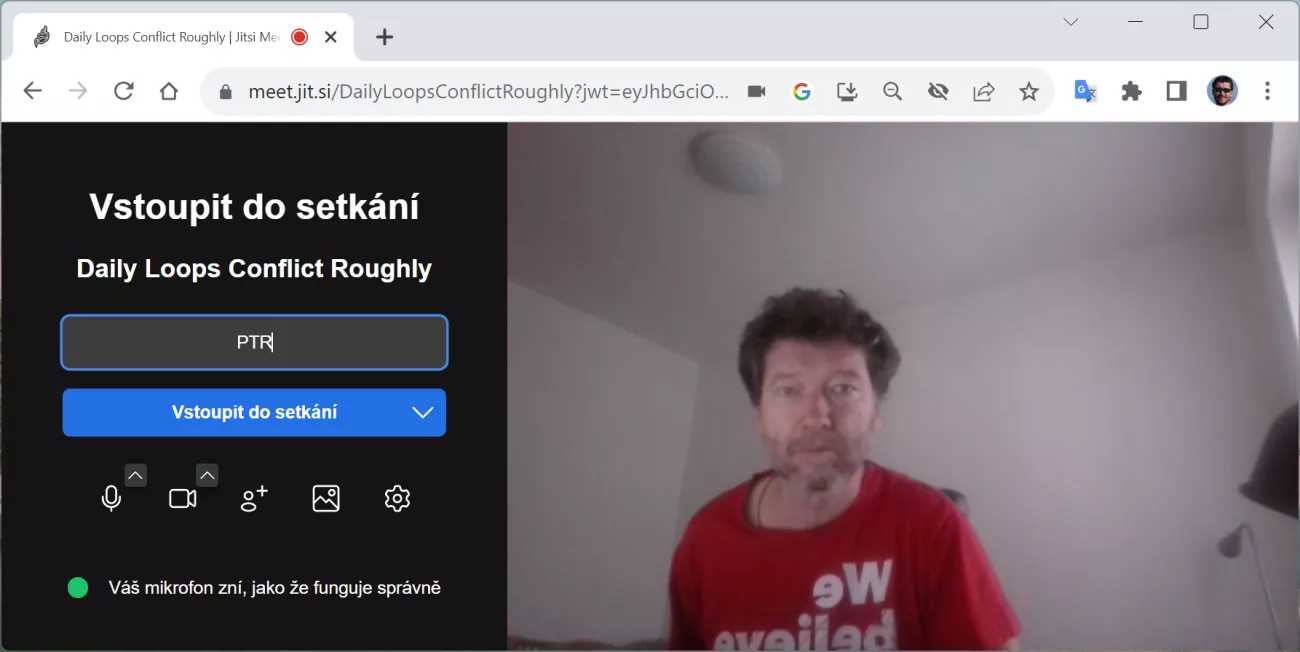 Poté se ocitnete v čekárně videochatu. Do příslušné kolonky zadáte své jméno a klepnutím na "Vstoupit do setkání" se připojíte jako první účastník. V pravé části okna prohlížeče se zobrazí záznam z vaší kamerky. Pokud přes okno přejedete ukazatelem myši, webová stránka zobrazí ve spodní části lištu s různými možnostmi. Pomocí ní můžete zapnout nebo vypnout kameru a mikrofon zvlášť nebo sdílet jiné okno otevřené ve Windows prostřednictvím sdílení obrazovky.