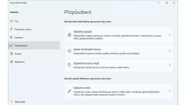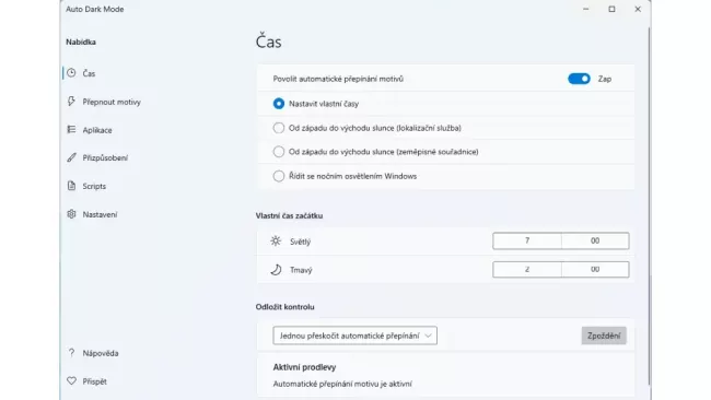Naštěstí existují volně dostupné nástroje, které vám s tím pomohou. Jedním z nich je například volně dostupná open source aplikace Auto Dark Mode X, která přepínání mezi světlým a tmavým designem uživatelského rozhraní Windows 11 automatizuje. Najdete ji i v oficiálním Microsoft Store. A mimochodem to funguje i na systémech Windows 11, které (ještě) nebyly aktivovány. Běžně jsou pro takové systémy změny vzhledu zapovězeny.