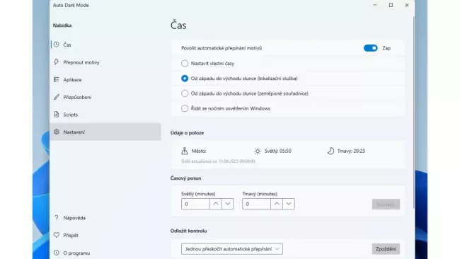 Podstatně přesnější výsledky poskytuje možnost „Od západu do východu slunce (lokalizační služba)“. Když si tuto možnost aktivujete, zjistí aplikace Auto Dark Mode X vaši aktuální polohu a během chvilky zobrazí časy východu a západu slunce, podle kterých bude přepínat Windows do světlého a tmavého režimu.