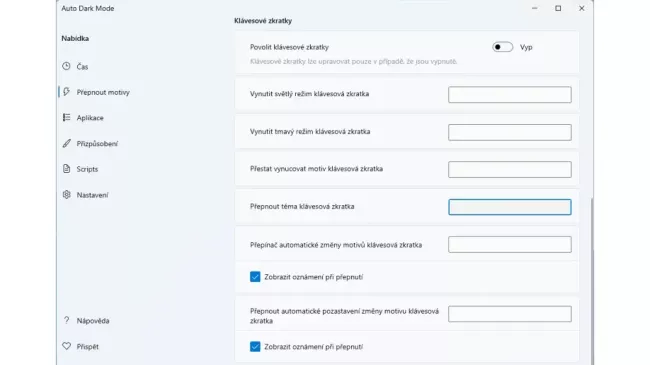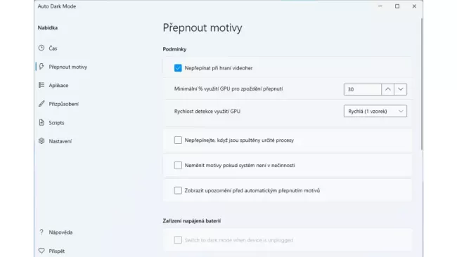 Klikněte v levém sloupci na nabídku „Přepnout motivy“, abyste mohli upravit rozšířená nastavení přepínání světlého a tmavého režimu. Pokud například pravidelně používáte svůj počítač k hraní her, aktivujte si předvolbu „Nepřepínat při hraní videoher“. Že zrovna hrajte pozná Auto Dark Mode X podle aktuálního vytížení grafického procesoru. -