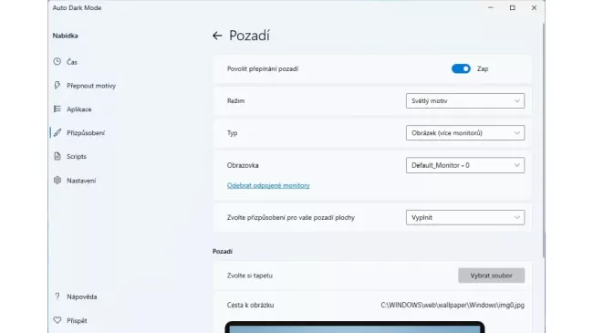 Následně aktivujte funkci „Povolit přepínání pozadí“ a zvolte si zvlášť obrázek pro světlý a tmavý režim prostředí Windows. K tomu slouží volby „Režim“ a „Zvolte si tapetu“, se kterými nejprve určíte, který obrázek se má zobrazovat při světlém designu, a po přepnutí na „Tmavý motiv“ také pozadí při tmavém režimu. -