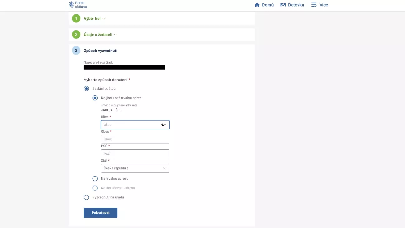 - Nyní vyplňte, kam má být papírový voličský průkaz doručen – zdali na trvalou adresu, na jinou adresu, anebo zdali si jej vyzvednete