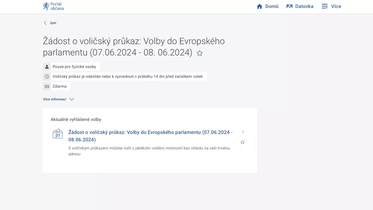 - Možnost rozklikněte a vyberte jediné probíhající volby: Volby do Evropského parlamentu 7. a 8. 6. 2024