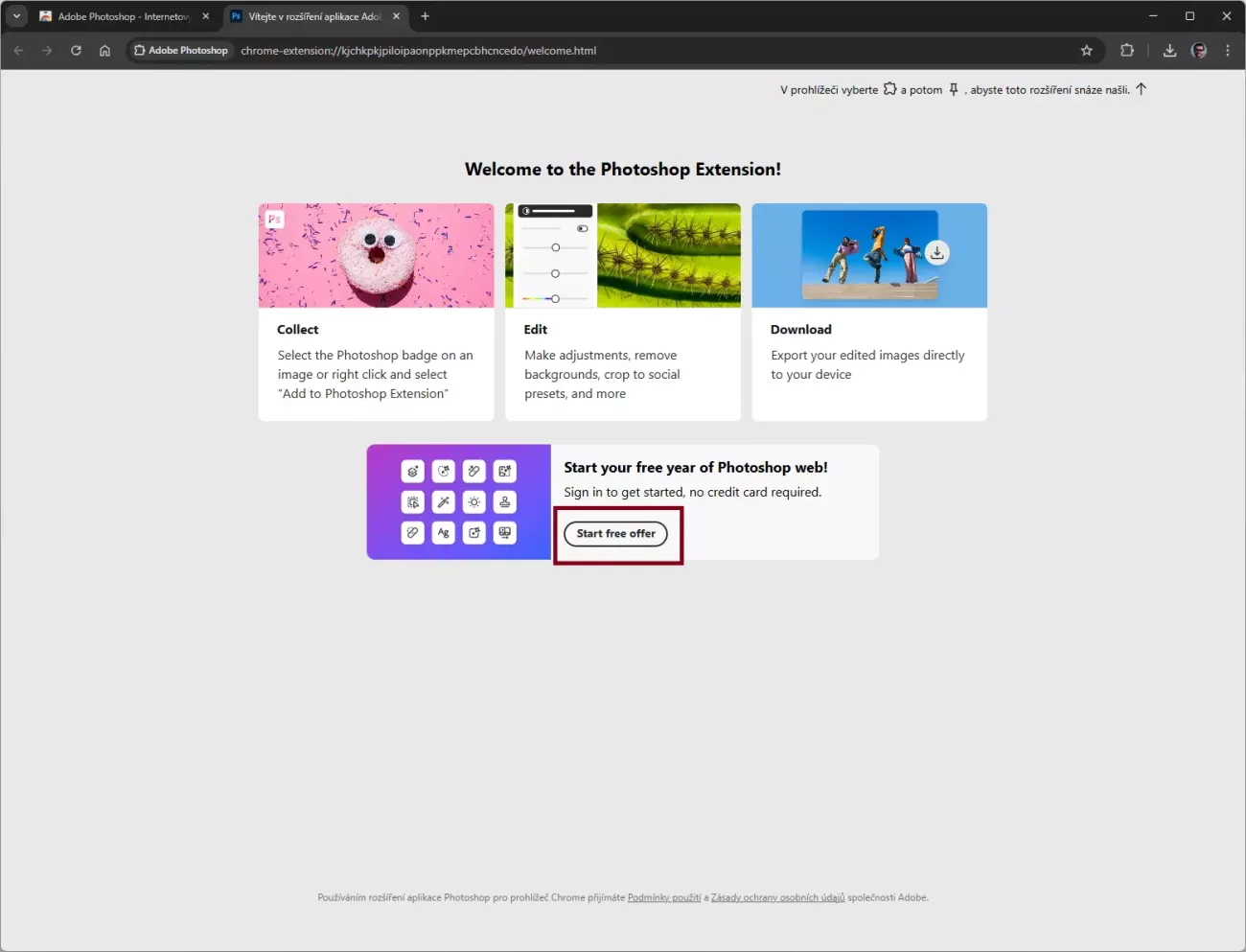 Po instalaci rozšíření je potřeba kliknout na "Start free offer".