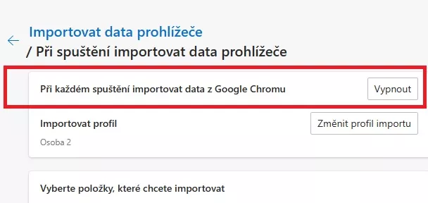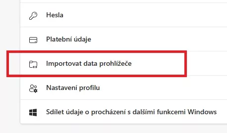 V prohlížeči Edge vložte do řádku s URL adresou edge://settings/profiles a vyhledejte položku "Importovat data prohlížeče". Rozbalte ji.