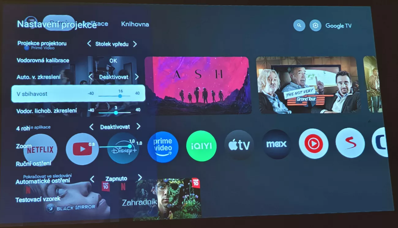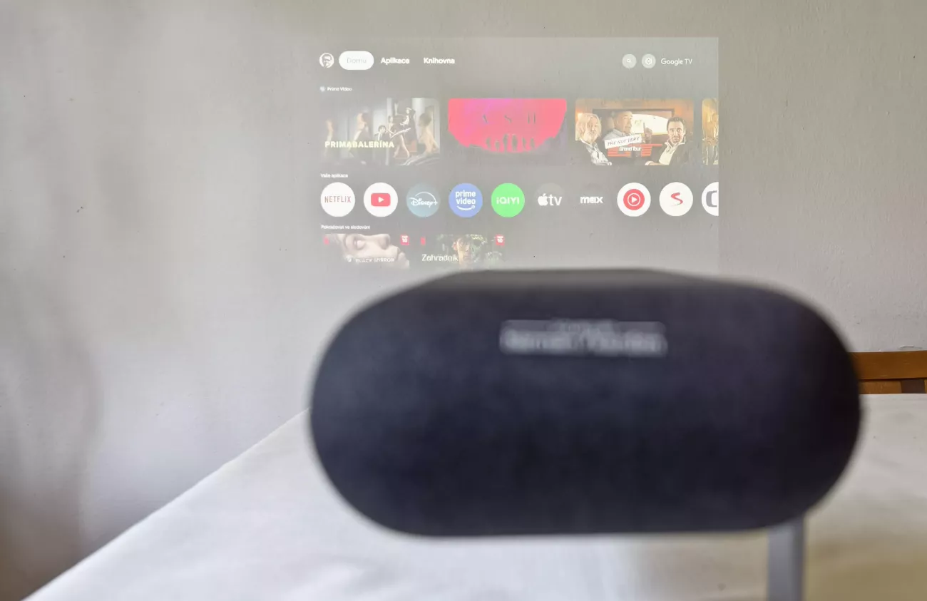 Projektor startuje asi minutu do známého prostředí Google TV. Sám se během několika sekund velmi dobře zaostří a snaží se i o korekci lichoběžníkového zkreslení – případně je k dispozici nabídka pro uzpůsobení obrazu.