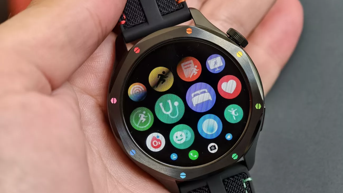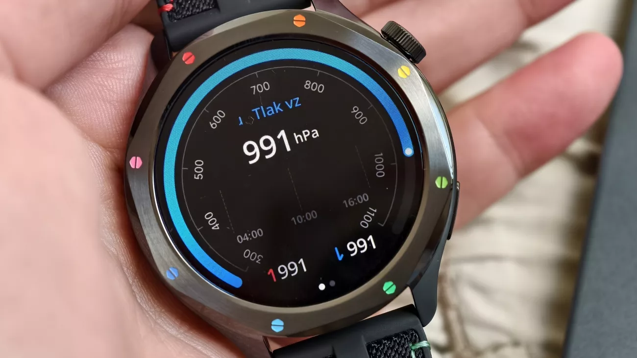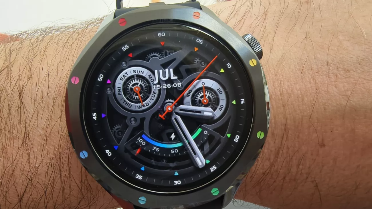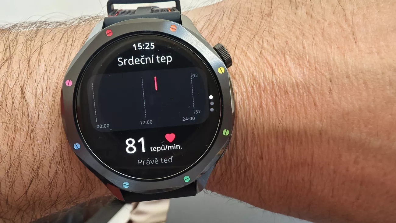 Hodinky působí elegantně a moderně, v testované verzi Rainbow možná až trochu rozpustitile, ale v prodeji jsou i varianty bez barevných teček okolo displeje. Dominantou je kulatý 1,43" OLED displej s vysokým rozlišením 466 x 466 bodů (329 ppi) a špičkovým jasem až 1 500 cd/m2, který zajišťuje pohodovou čitelnost i na přímém slunci.