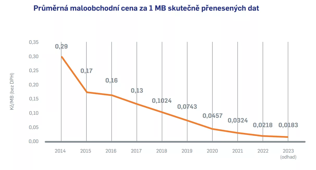 Za sledované období od roku 2014 do poloviny roku 2023 klesla průměrná jednotková cena za MB dat (bez zahrnutí fixního LTE/5G) o více než 0,27 Kč, tj. cca o 93,7 %, přičemž za posledních 5,5 roku (mezi rokem 2017 a pololetím 2023) klesla o více než 0,11 Kč, tj. o necelých 86 %, na 0,0183 Kč/MB.