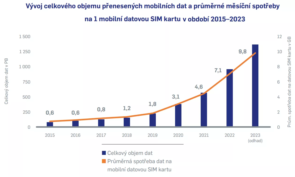 Co se týká objemu přenesených dat v mobilní síti, Český telekomunikační úřad ve své zprávě uvádí, že za rok 2023 dosáhl hodnoty Český telekomunikační úřad 1,35 tis. PB a jeho meziroční nárůst lze odhadnout na 43 %. Průměrná měsíční spotřeba dat na datovou SIM kartu dosáhla asi 9,8 GB – v předchozím roce přitom šlo o 7 GB. Mezi zákazníky roste penetrace tarifů s vysokým či neomezeným objemem mobilních dat.
