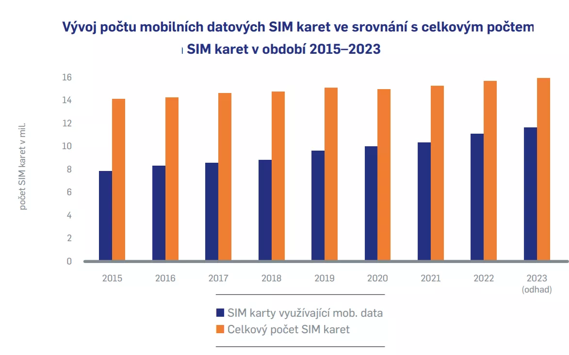 Celkový počet mobilních SIM karet využívajících přístup k internetu dle odhadu Úřadu přesáhl 11,4 mil. a přiblížil se třem čtvrtinám celkového počtu mobilních SIM karet.